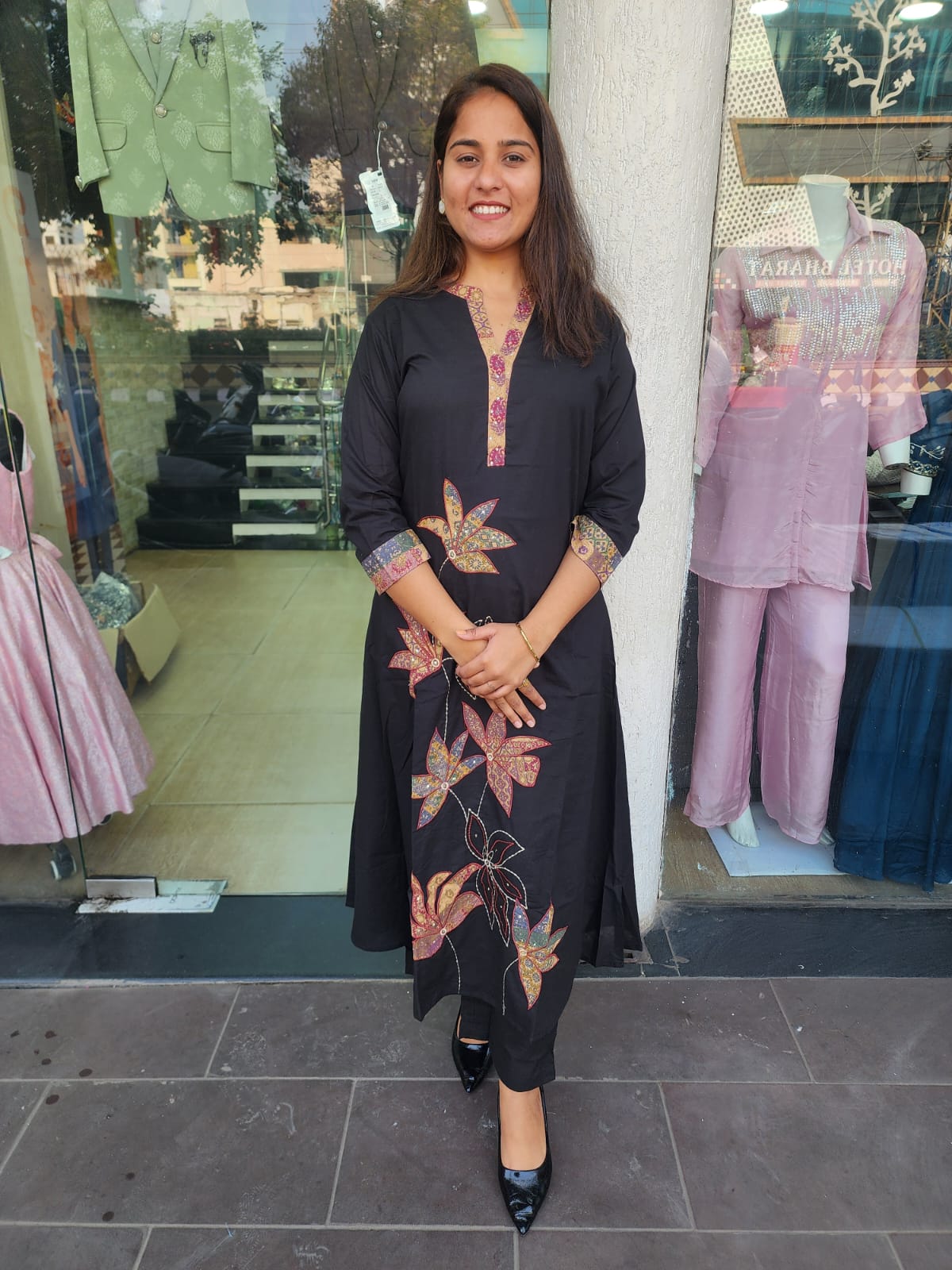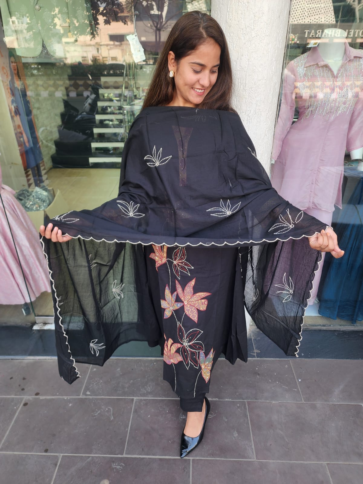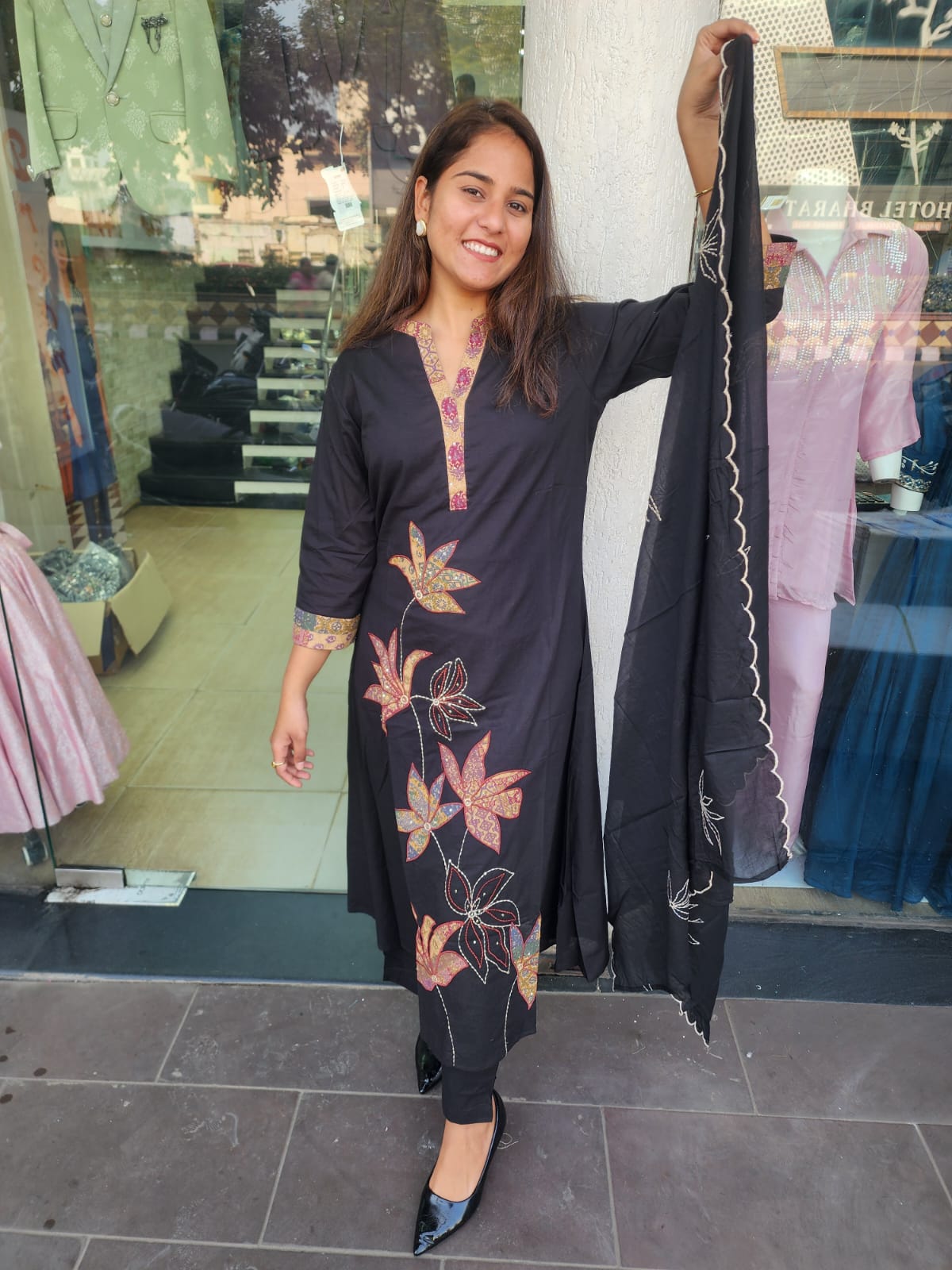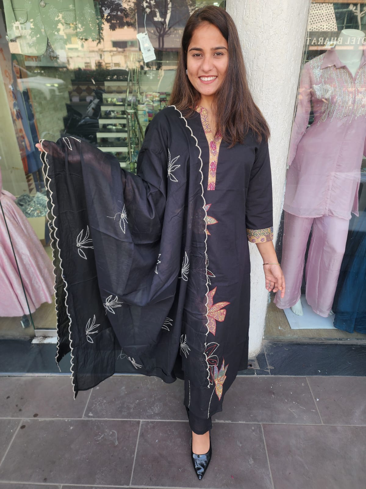 Black Cotton Patch Work Suit With Katha Stitch Dupatta