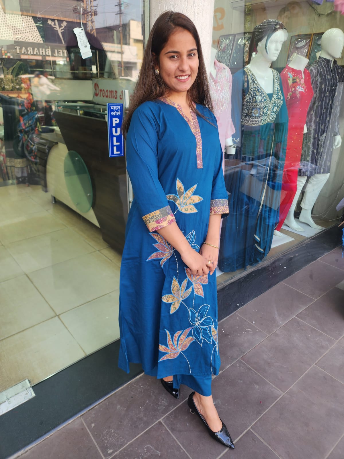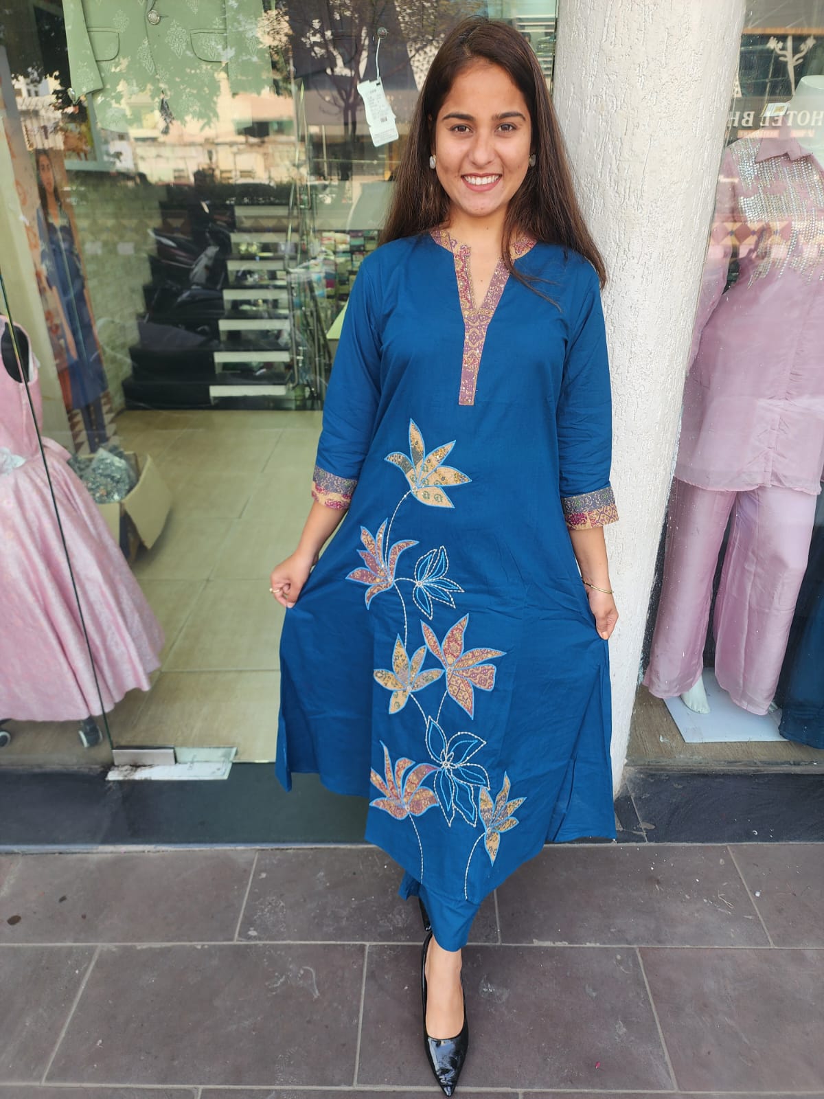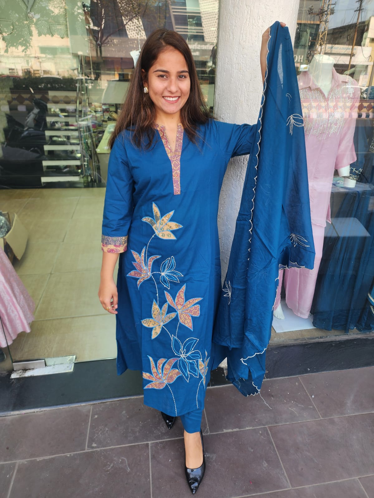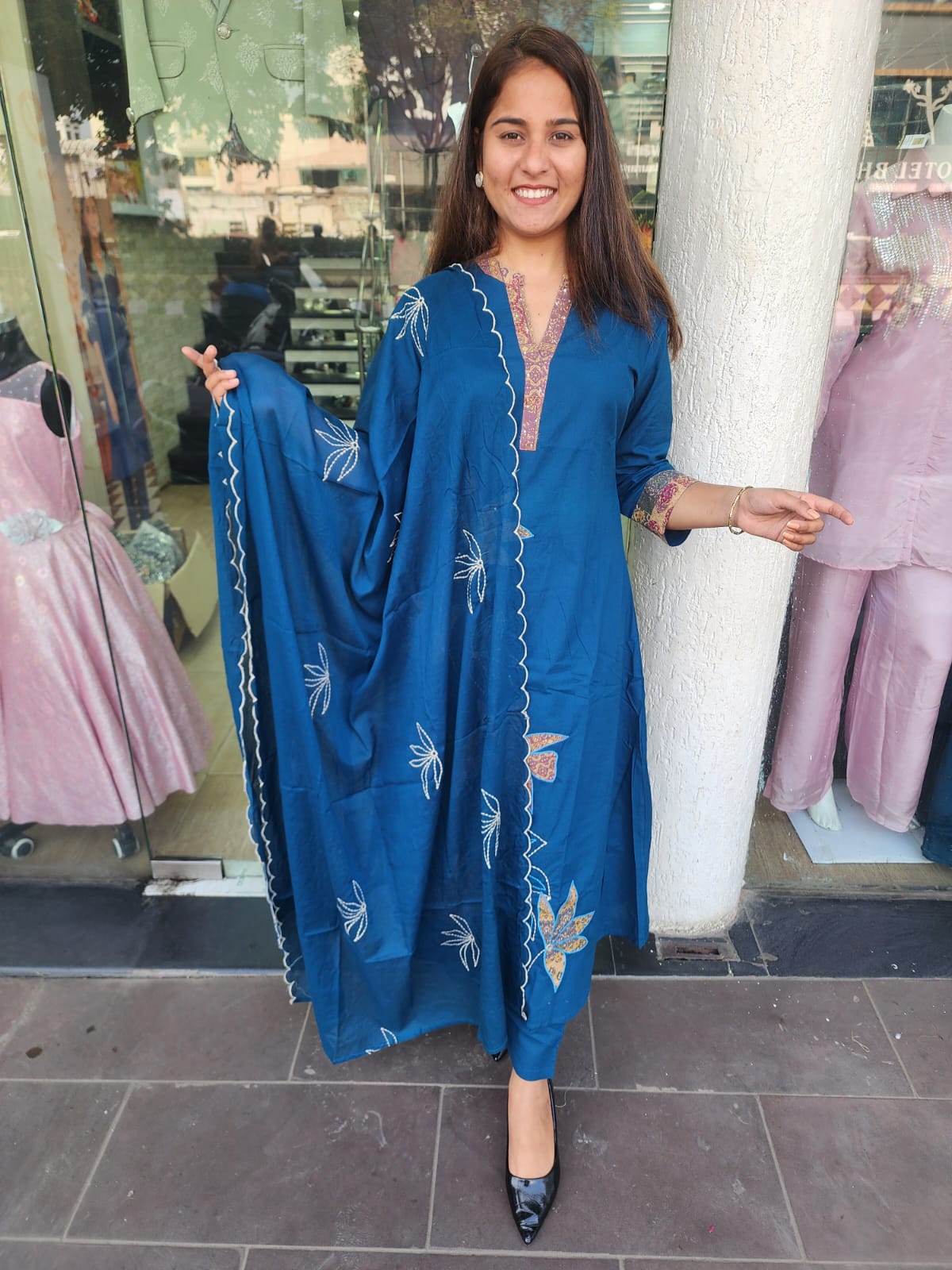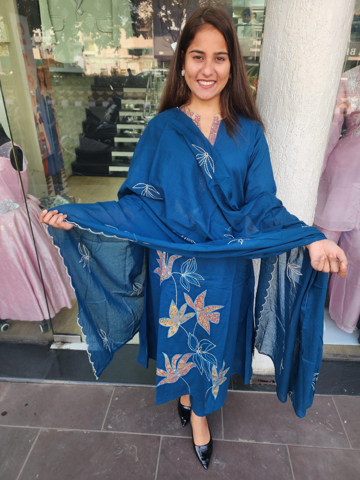 Blue Cotton Patch Work Suit With Katha Stitch Dupatta