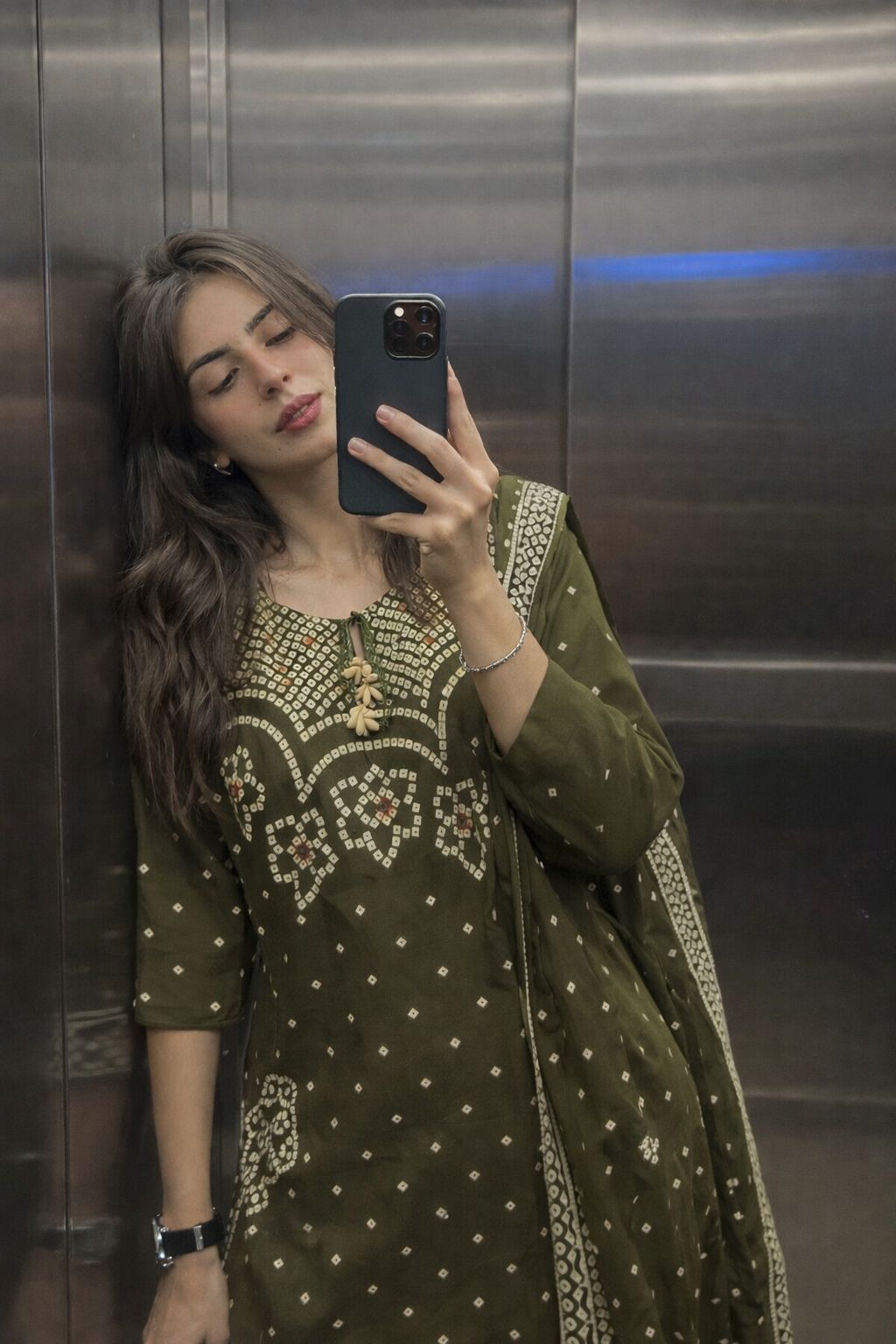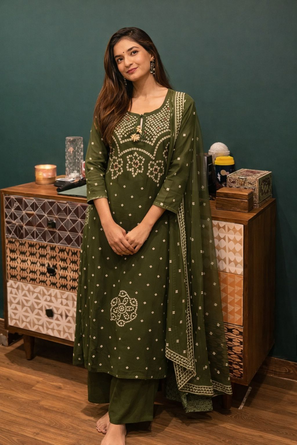Green Pure Mal Cotton Bandhej Print Dupatta Set