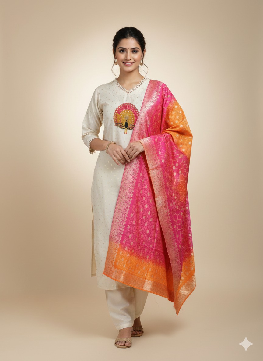 Mal Silk Ivory Dupatta Set with Peacock Design with Beautiful Banarasi Dupatta