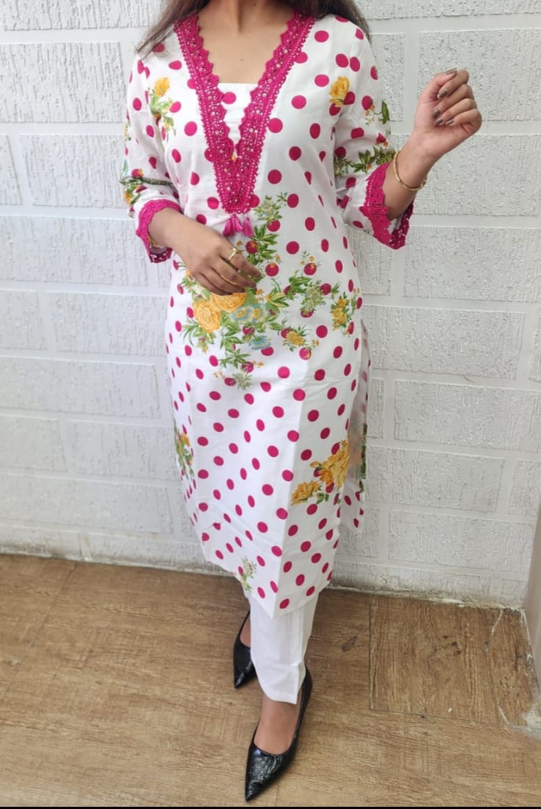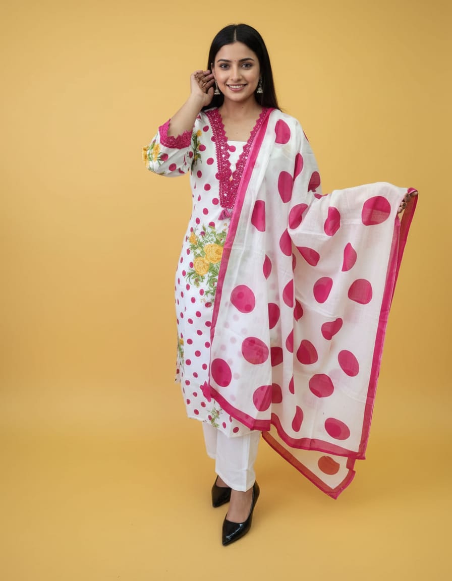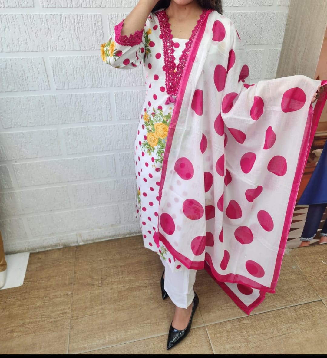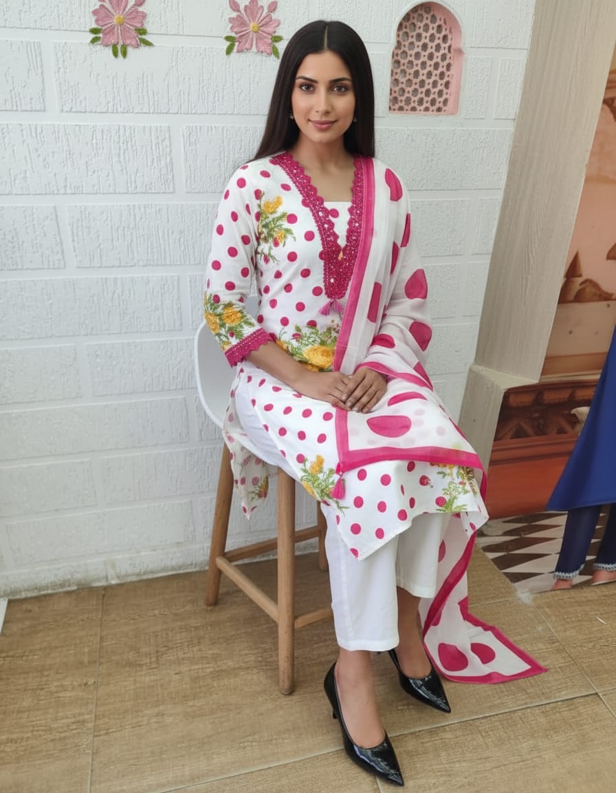 Pink Pulka Dots Pure Cotton Crochet Designing Dupatta Set