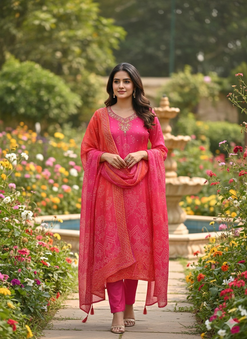 Pure Pink Crape Silk Dupatta Set in Bandhej Print