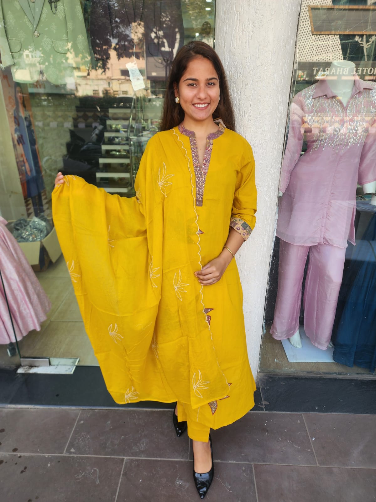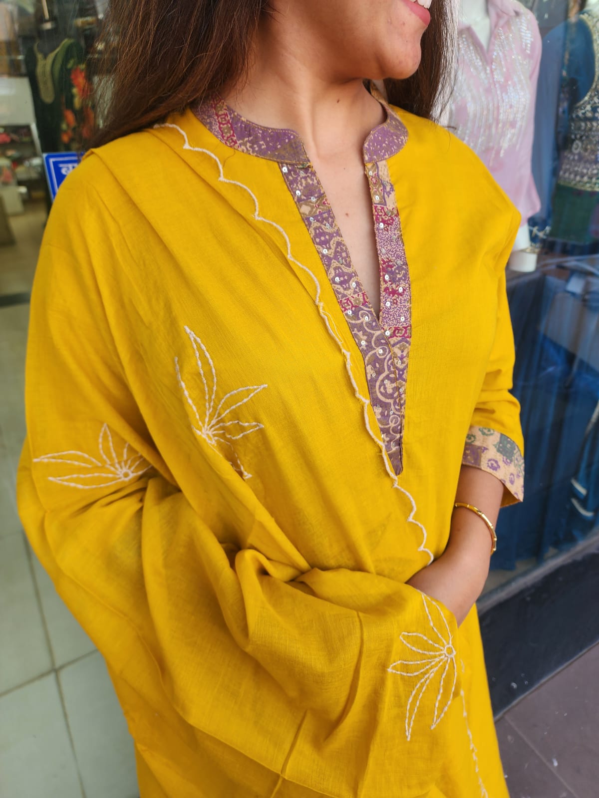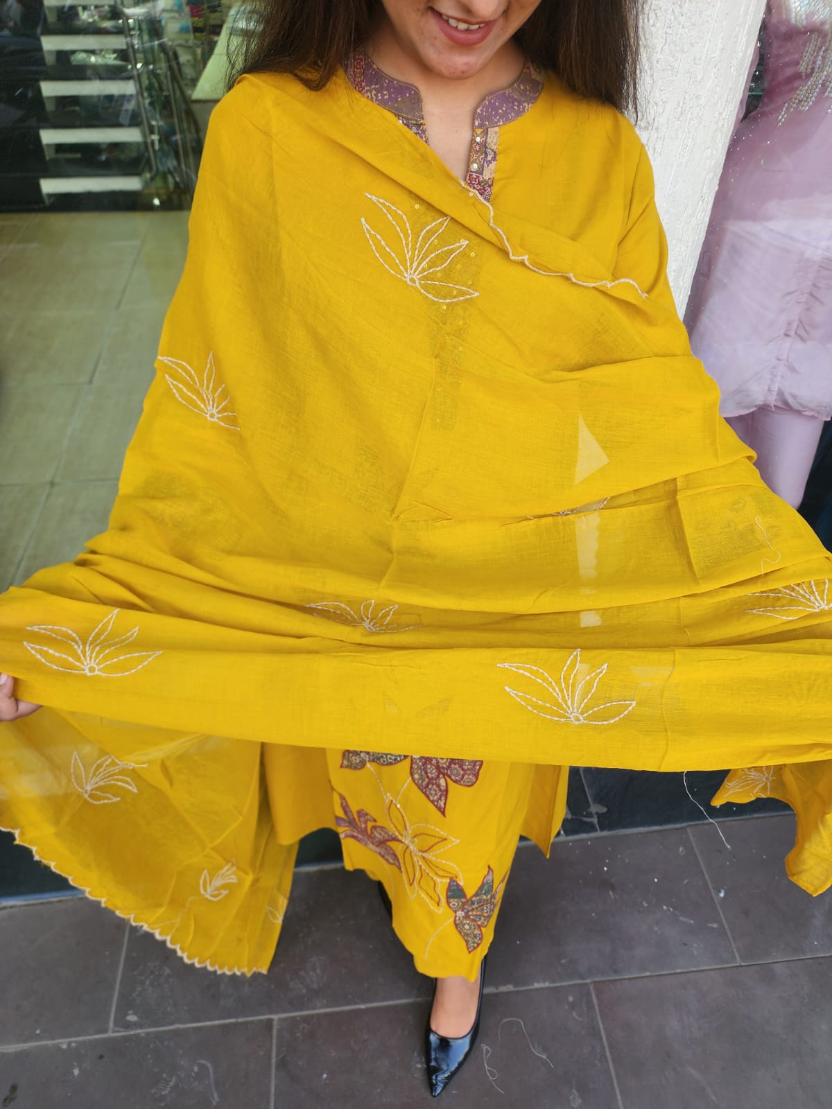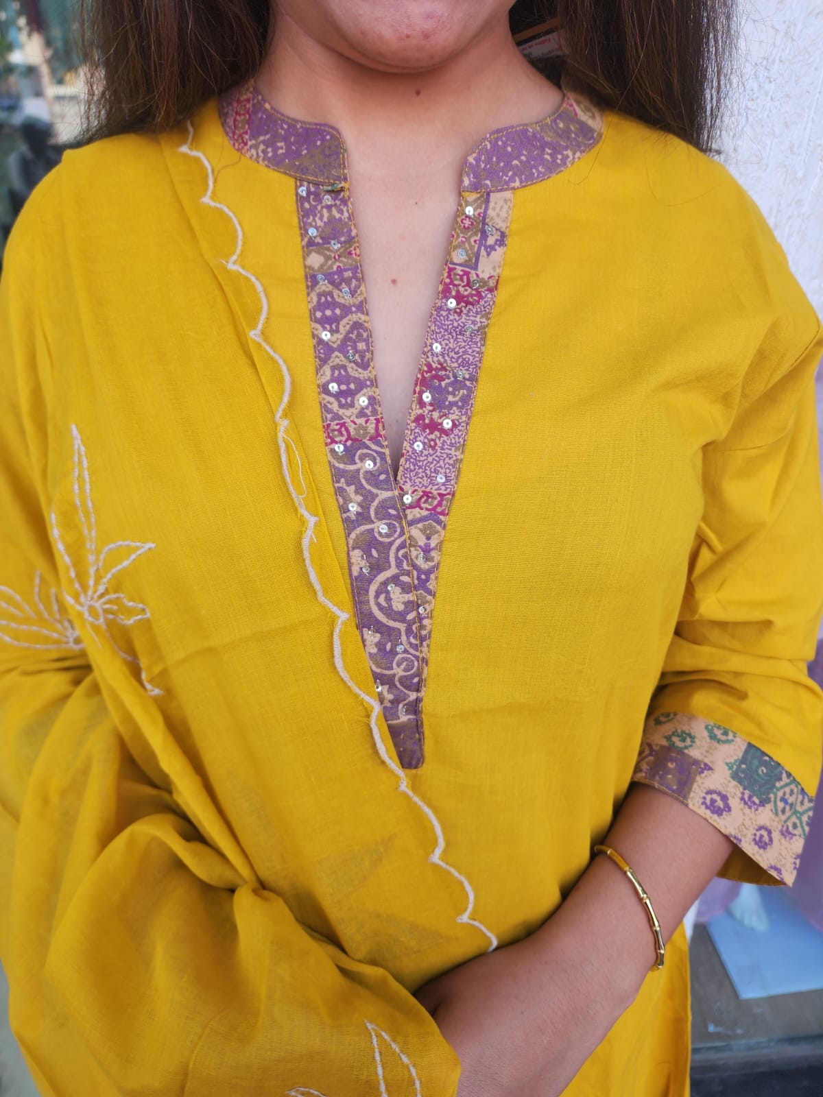 Yellow Cotton Patch Work Suit With Katha Stitch Dupatta